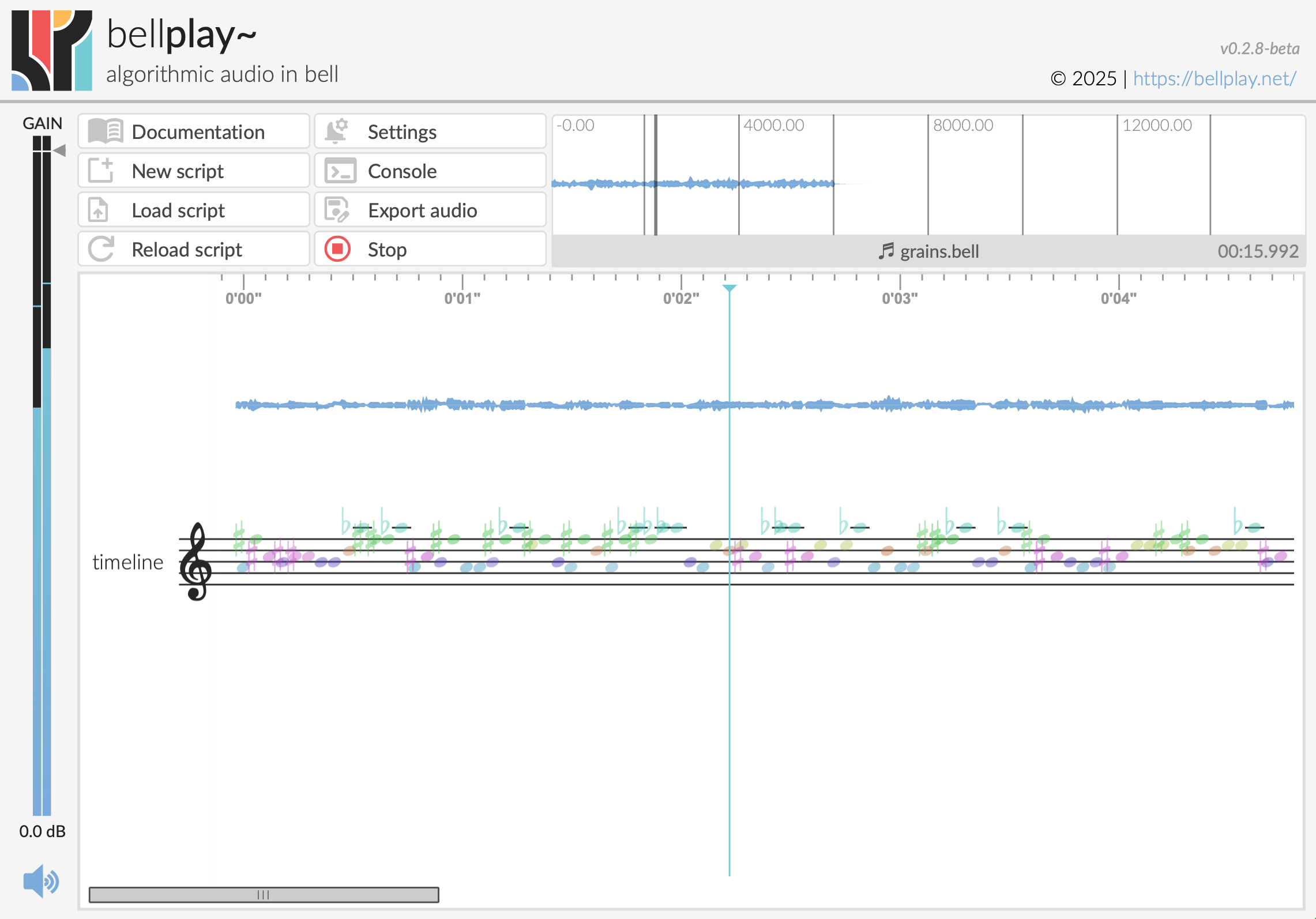 bellplay~ is a standalone application for algorithmic audio composition and sound design. It's designed to enable fast prototyping of sounds through code, combining a wide range tools for synthesis, sampling, analysis, processing and more, in a unified workflow.